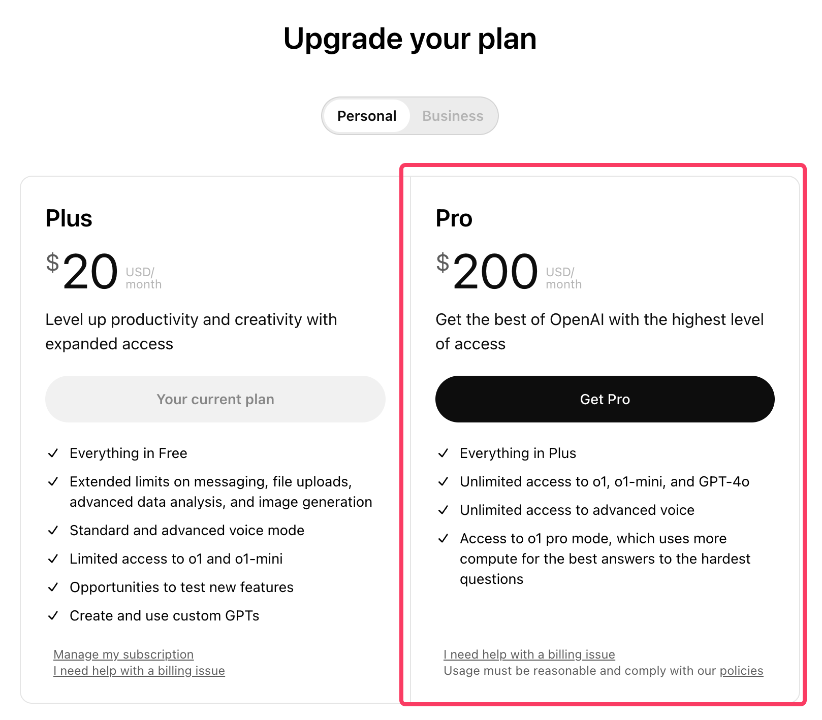 これまで、無料版か、月額20ドルの有料版「ChatGPT Plus」しか存在しなかったChatGPTに、「ChatGPT Pro」という月額200ドルのより高額なプランが導入された。