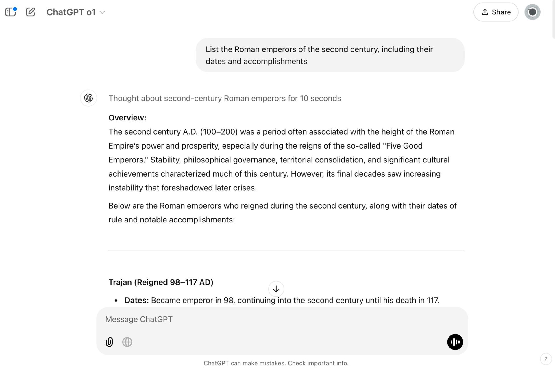 ライブ配信では、o1-previewとの性能比較のデモとして、o1がローマの皇帝をより高速で正確に列挙する様子が紹介された。