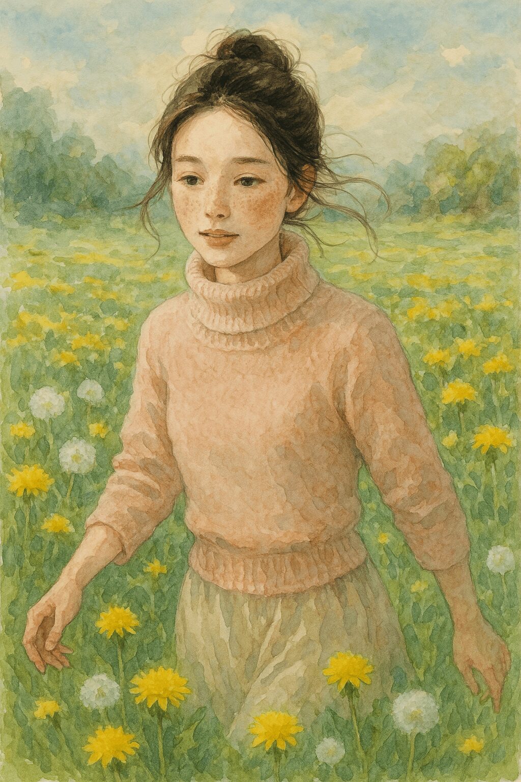 この人物を水彩画を用いた写実的なイラストにして、タンポポ畑を散歩している様子を描いてください。髪の色や髪型、服の色や形、顔の特徴(頬の赤み、そばかす)がしっかりと維持された上で、水彩画っぽく変換されている。