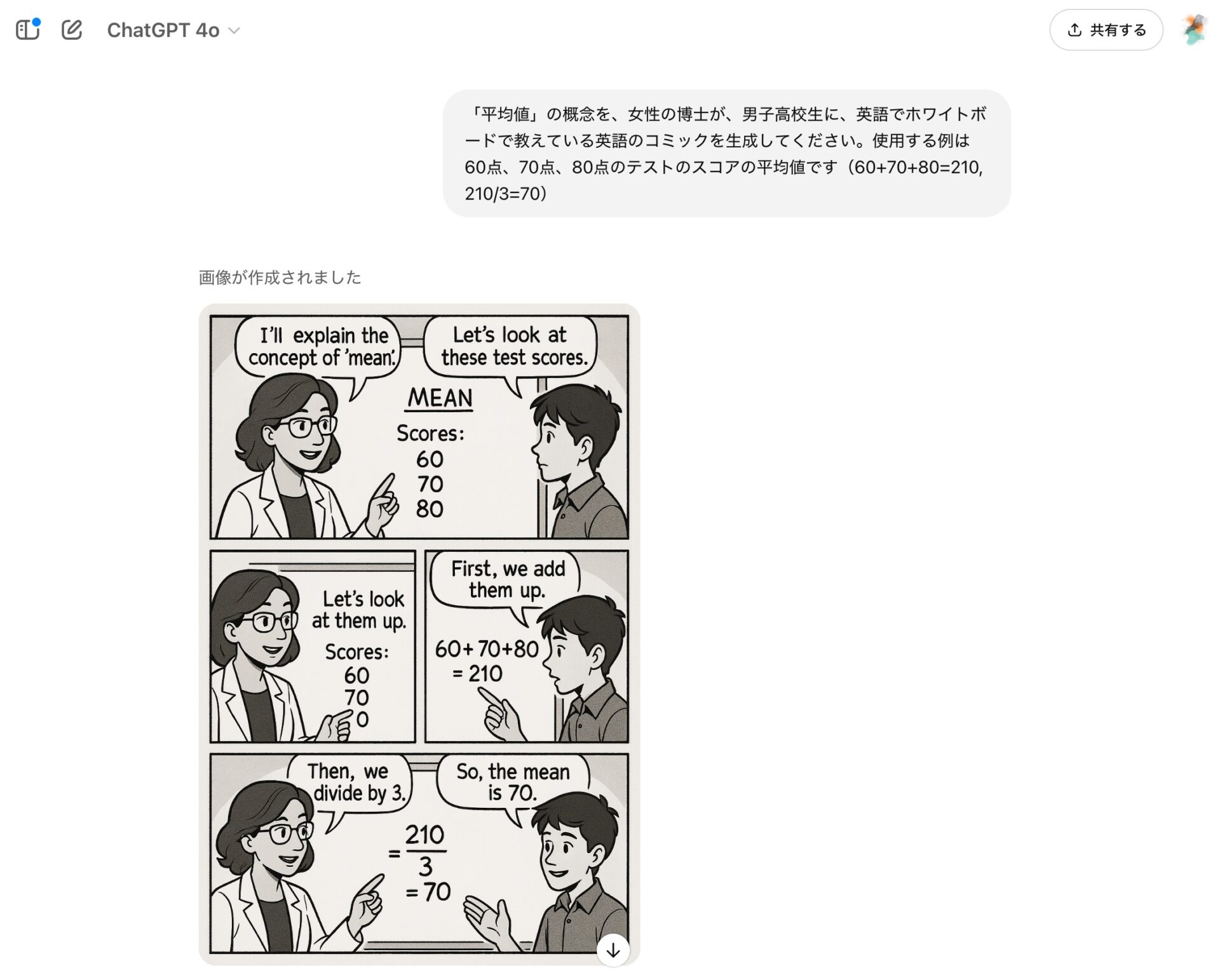 また、生成するイラストの中に、GPT-4oが持っている知識を反映することも可能だ。例えば、以下は「平均値」について解説するコミックを、GPT-4oに描いてもらった例だ。