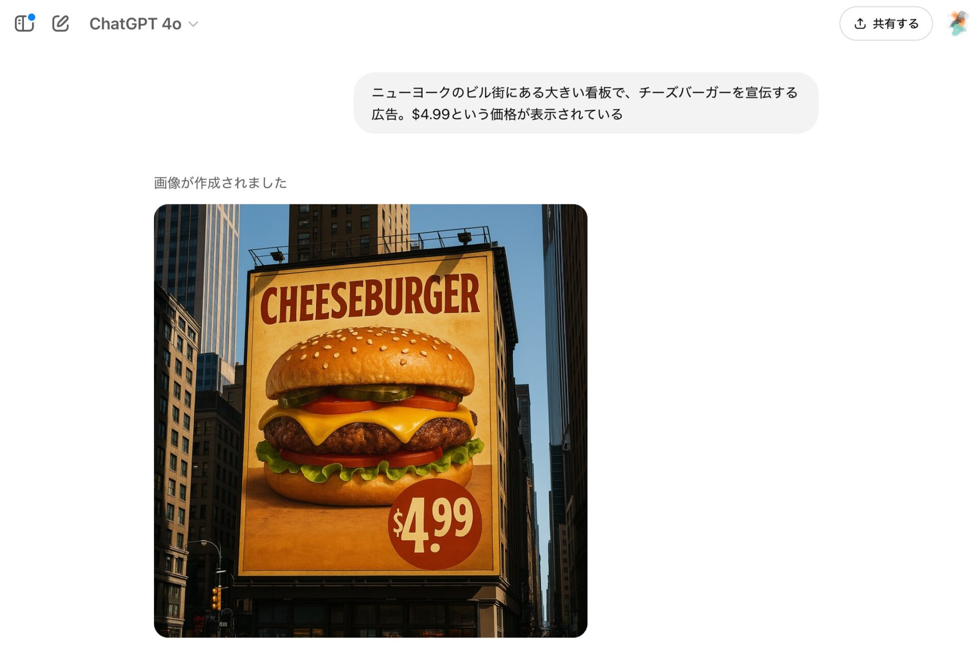 ニューヨークのビル街にある大きい看板で、チーズバーガーを宣伝する広告。$4.99という価格が表示されている
