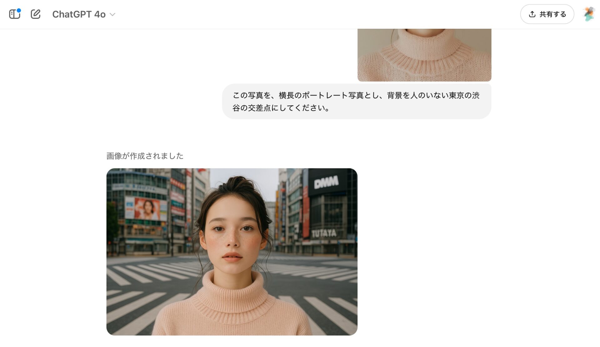 この写真を、横長のポートレート写真とし、背景を人のいない東京の渋谷の交差点にしてください。背景が「人のいない渋谷交差点」というかなり特殊なシナリオなので、難易度が高い指示のように思えるが、以下のようにバッチリ注文通りに生成してくれた。