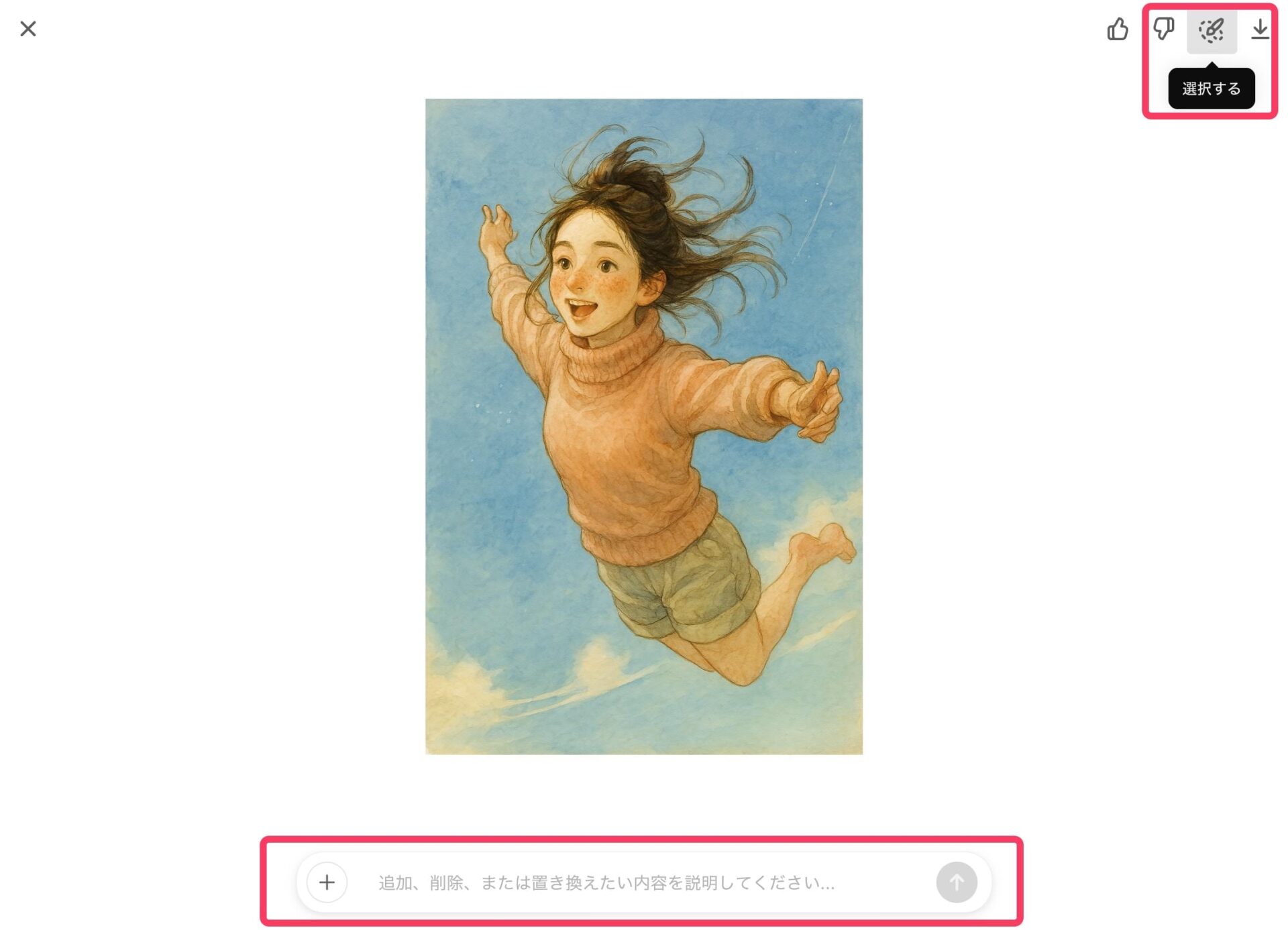 生成された画像について、追加、削除、置き換えたい部分がある場合に、編集したいエリアを指定した上で、追加の修正指示をすることができる。