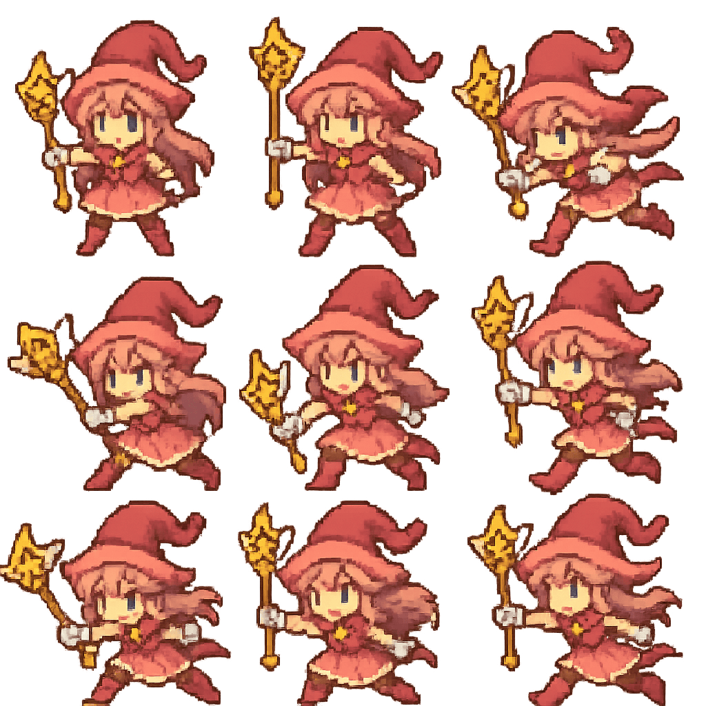 ファンタジーゲームに登場する魔法少女の主人公のピクセルアートを9種作成してください。いずれも戦闘シーンで利用できる様々な姿勢のバリエーションをつけてください。背景は透過してください。