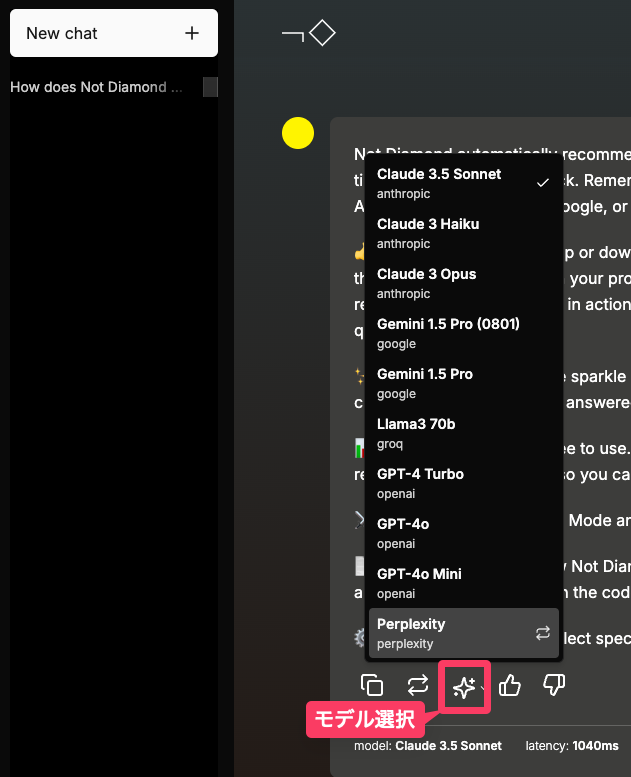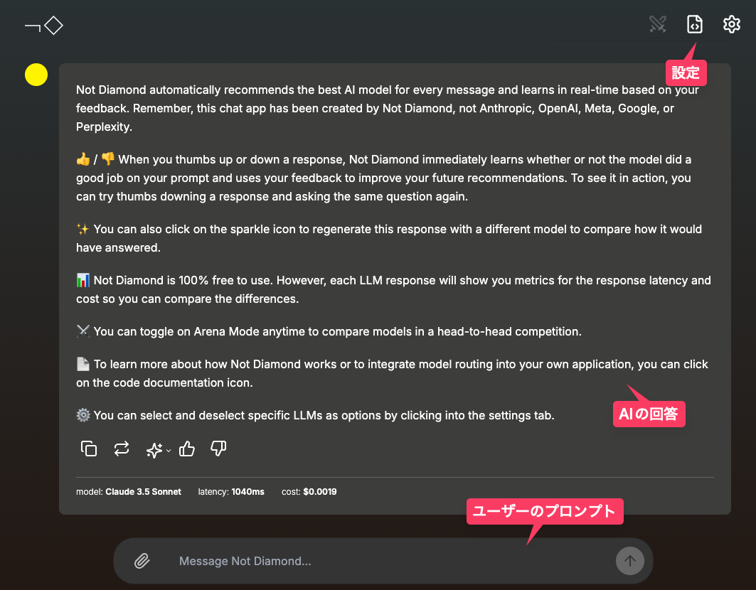 Not Diamondは、ユーザーのプロンプトに対して、最適なAIモデルを自動で選び、そのモデルに回答を生成させる。