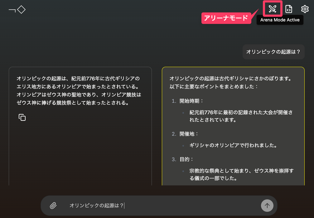 画面右上にある刀マークのアイコンを使用すると、2つのモデルで回答を生成して、バトルをさせる「アリーナモード」を有効にできる。