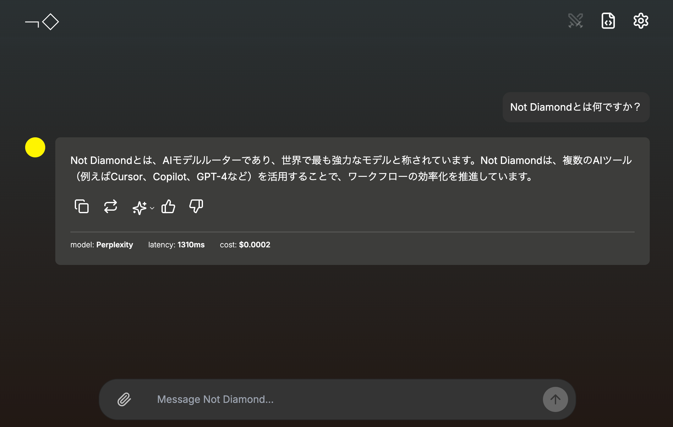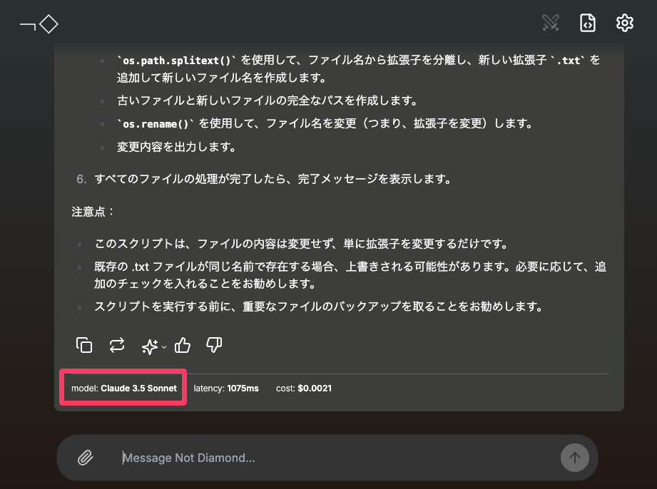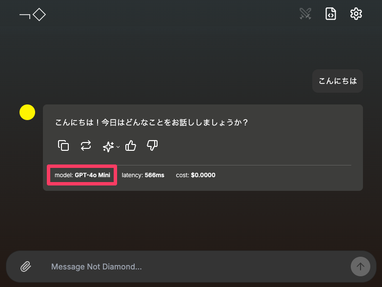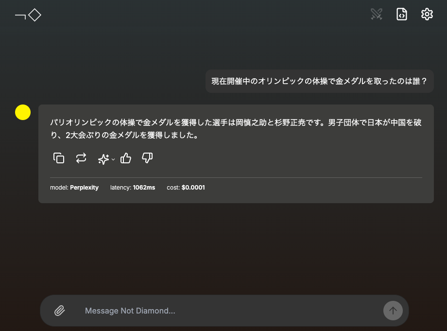 何も考えず、とりあえず質問を打ち込んでみると、早速Not Diamondが最適なAIモデルを選択して、回答を表示してくれる。