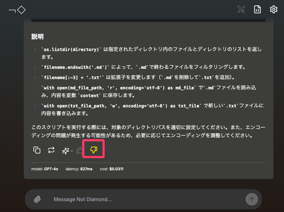簡単なプログラムのコードを書いてくれるように頼んでみた。Not Diamondが選んだのはGPT-4oであった。