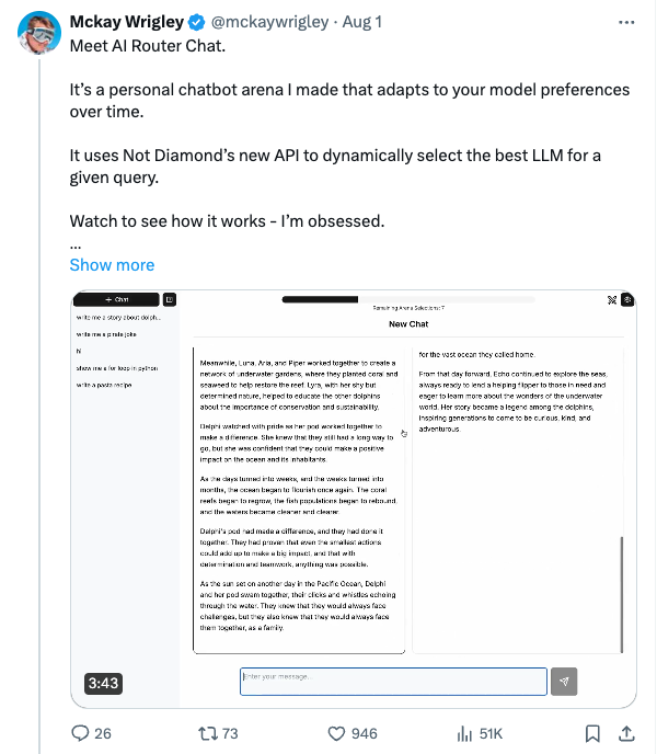 「AI Router Chat」は、Not Diamondがリリースされた直後に、オープンソース開発者のMckay Wrigley氏によって公開されたオープンソースのアプリだ。