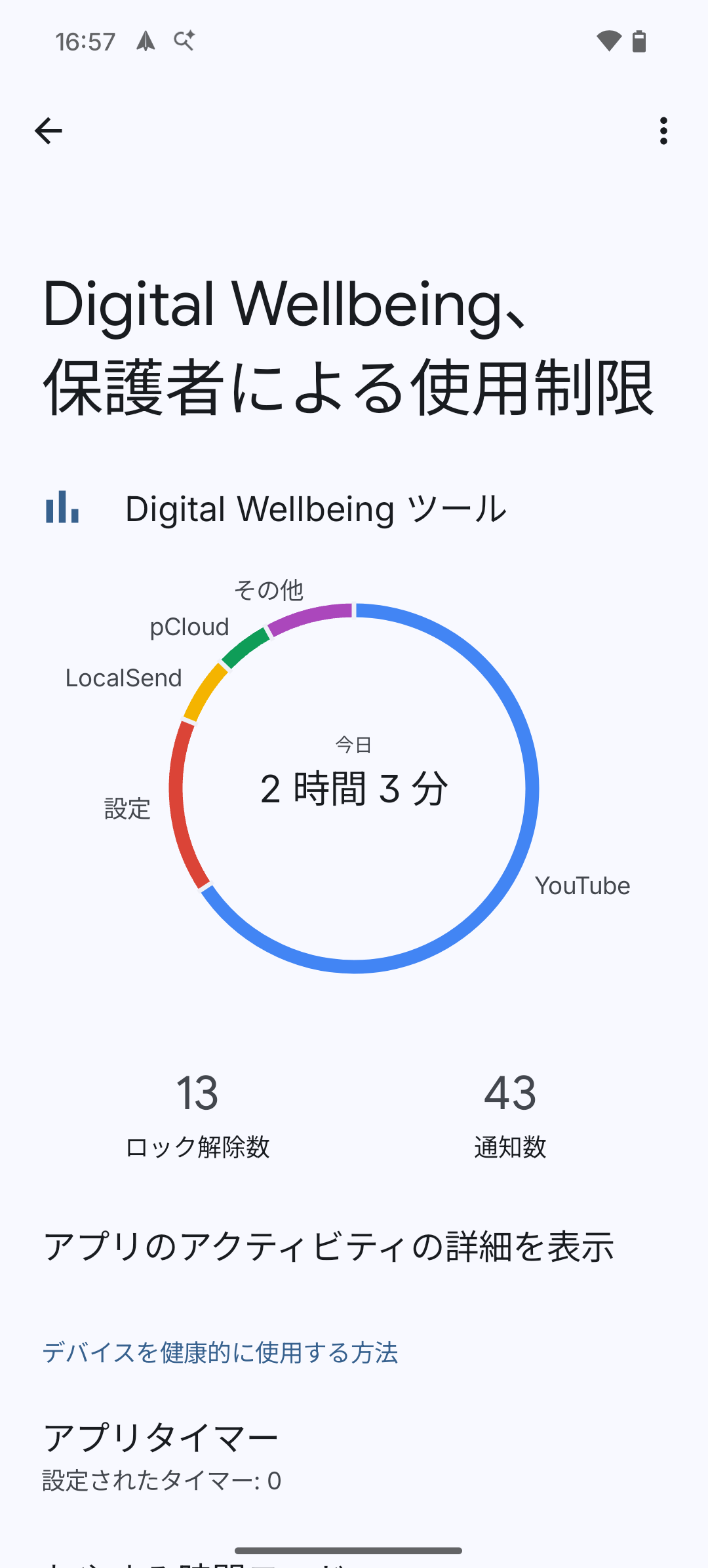 - アプリタイマー: 特定のアプリに1日の使用時間制限を設定