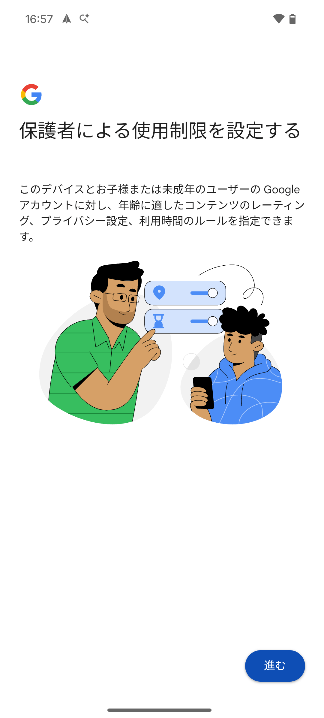 より高度な管理(位置情報の確認、アプリ購入の承認、学校時間中の制限など)が必要な場合は、「Google ファミリーリンク」アプリを併用するとよい。