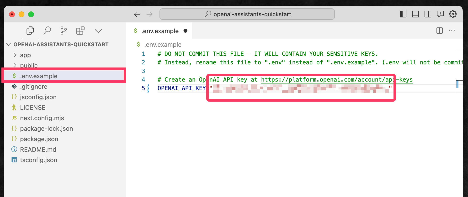 前の手順でダウンロードして作成した「openai-assistants-quickstart」フォルダを、テキストエディタで開くと、.env.exampleという隠しファイルがある。