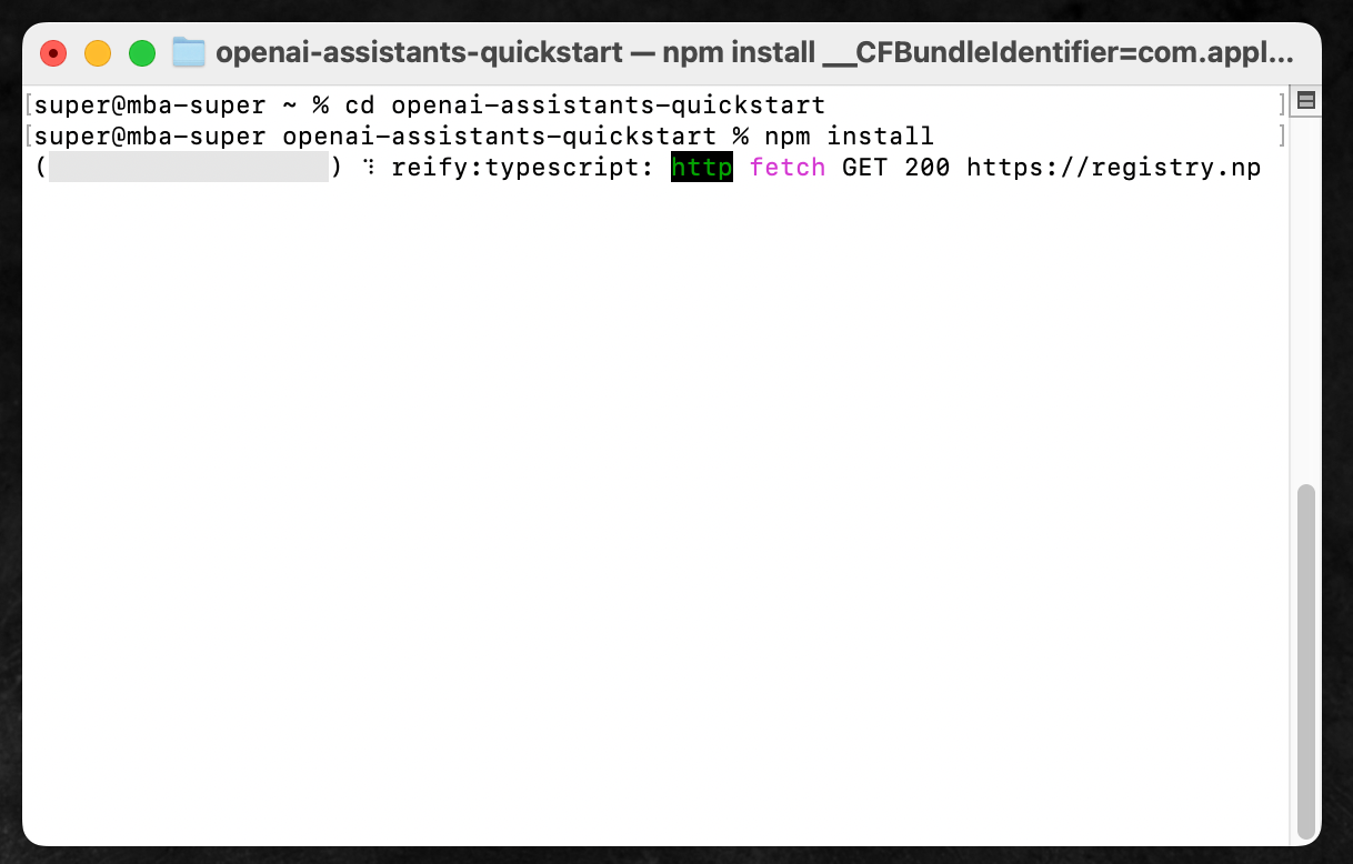 brew install nodeNode.jsもインストールできたら、あとは先ほど紹介したように、openai-assistants-quickstartフォルダの中で、npm installコマンドを実行すれば良い。