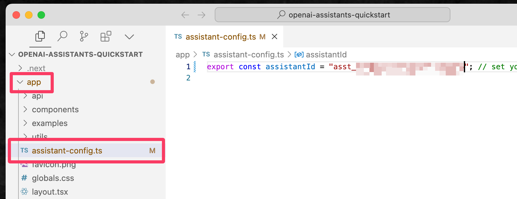 VS CodeやCursorなどのテキストエディタで、再びopenai-assistants-quickstartフォルダを開き、/appフォルダの中にあるassistant-config.tsというファイルの中に、ここで生成されたアシスタントIDをペーストして上書き保存する。