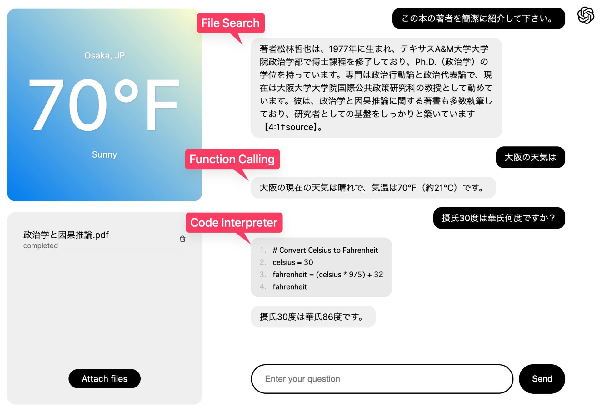 まず、読み込ませたナレッジファイルである『政治学と因果推論』の著者プロフィールを尋ね、File Searchによる回答を得たら、今度は著者が務める大学の天気予報を聞いて、Function Callingの結果を表示し、さらに気温の計算についてCode InterpreterでPythonコードを実行させる・・・という一連の流れが、単一のチャット画面で実行できる。