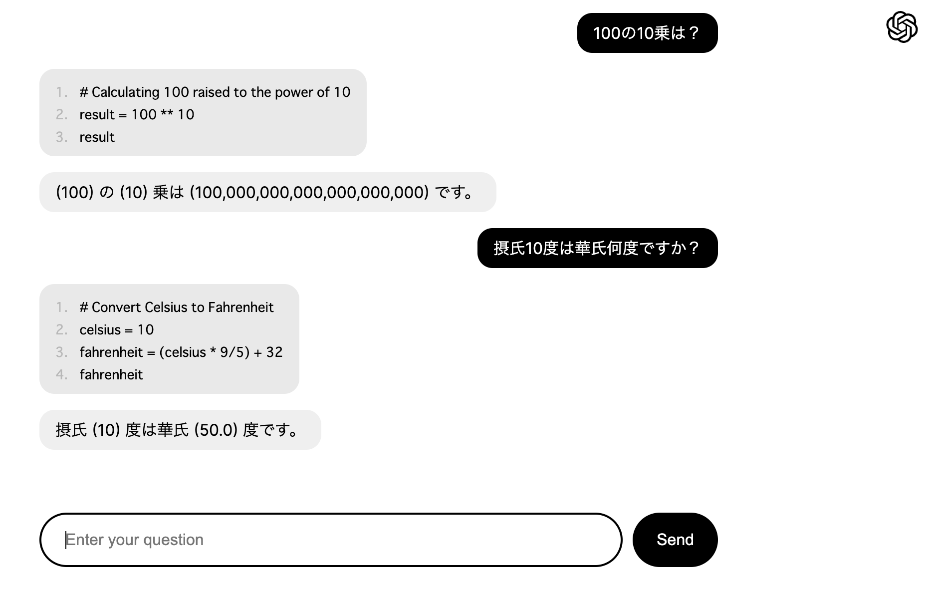 Assistants APIは、Pythonの実行環境であるCode Interpreterも備えているので、チャットの会話の中で計算などを依頼して、実行結果を教えてもらうこともできる。