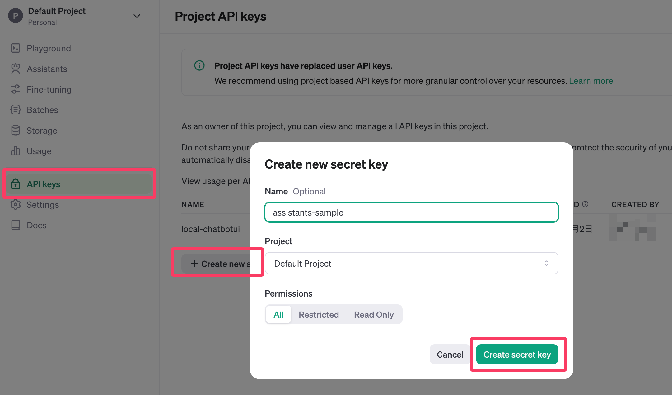 OpenAIのAPIページで、「Create new secret key」をクリックして、分かりやすく「assistants-sample」などと名前をつけておく。表示されたAPIキーは一度しか表示されないので、コピーして記録しておく。