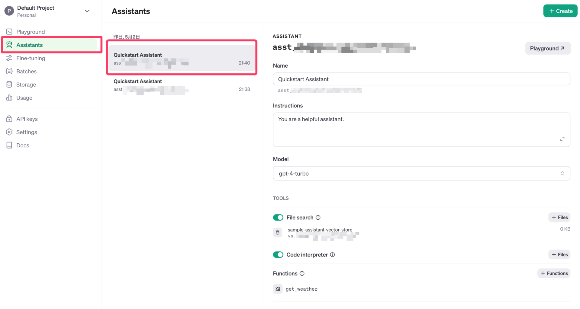なお、Quickstartで設定したアシスタントは、OpenAIのWebサイト上からも確認できる。