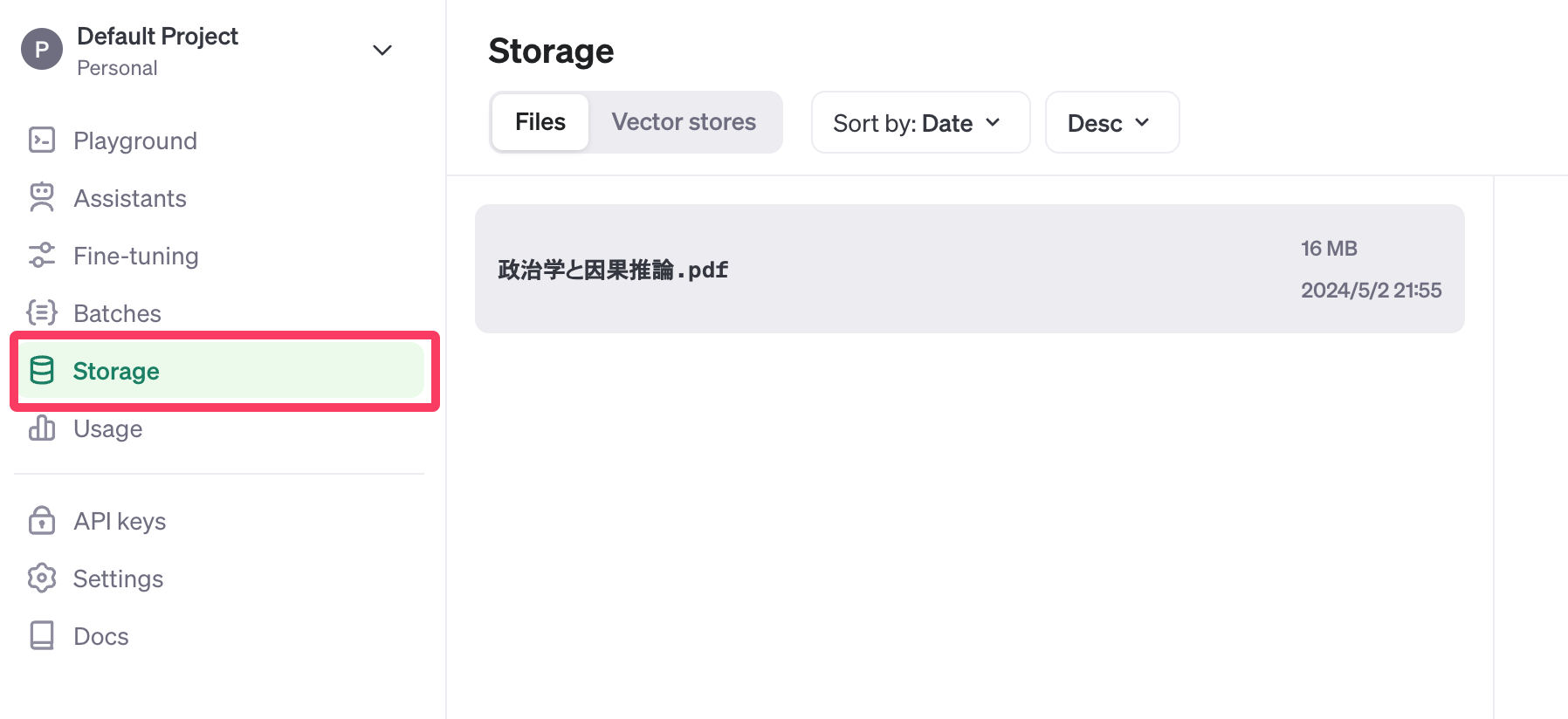 OpenAIのプラットフォームにログインして、「Storage」メニューを確認すると、Assistants API Quickstartで利用したファイルが保管されているので、これを削除しておくようにする。