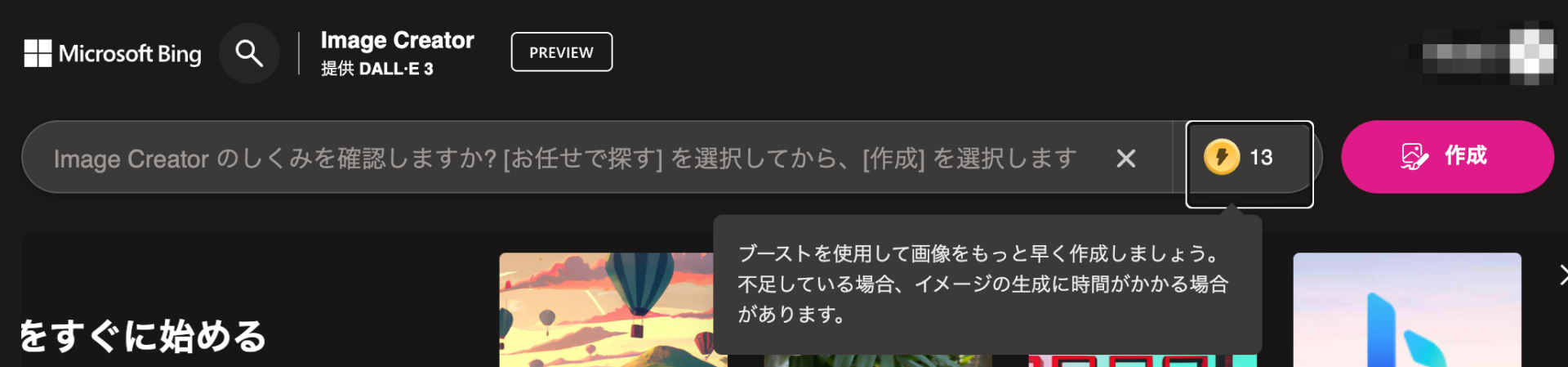 「ブースト」とは、画像生成を高速化するための通貨のようなもので、Bingチャットなどで画像を1回生成するたびに、1枚のブーストを消費する。