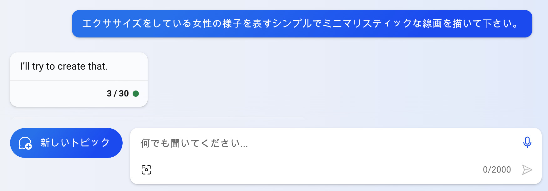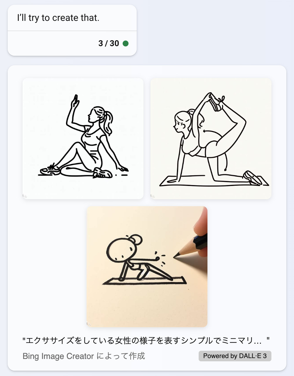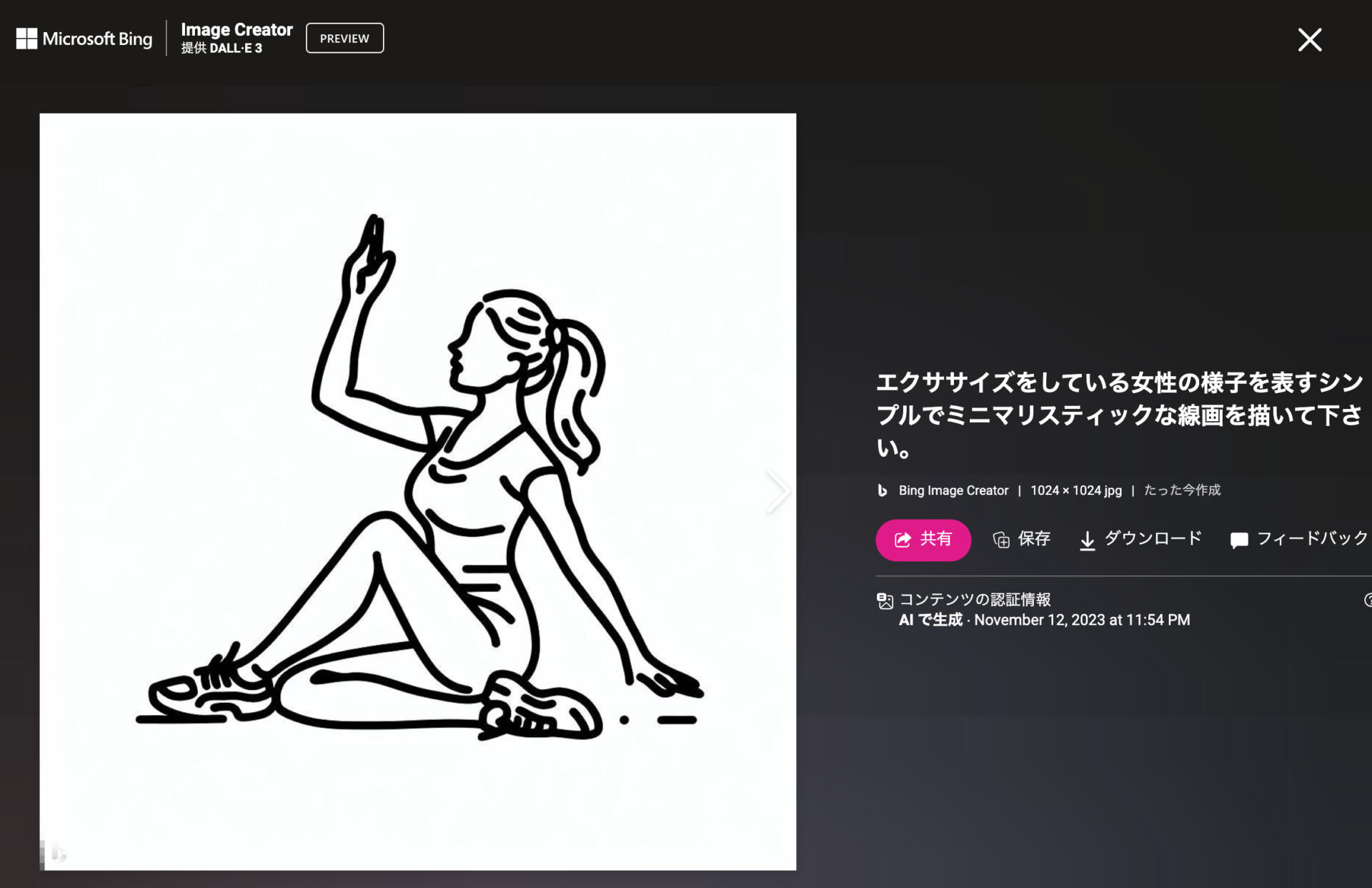エクササイズをしている女性の様子を表すシンプルでミニマリスティックな線画を描いて下さい。すると、以下のような「画像が生成されています」というメッセージが表示され、画像が生成されるまでしばらく待機する。