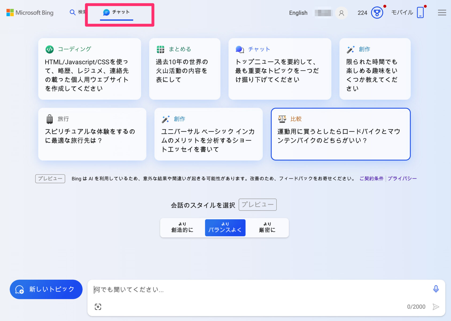 そもそもBing Chatは、Microsoft Bingのトップページで、「検索」と並んで「チャット」と表示されているアイコンをクリックすると利用することができる。