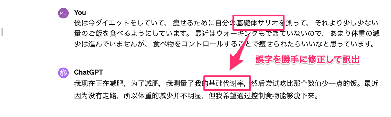 適切なプロンプトを使わないと、ChatGPTは通訳として働くのではなく、普通に会話の内容に対してリアクションをしてきてしまう場合がある。
