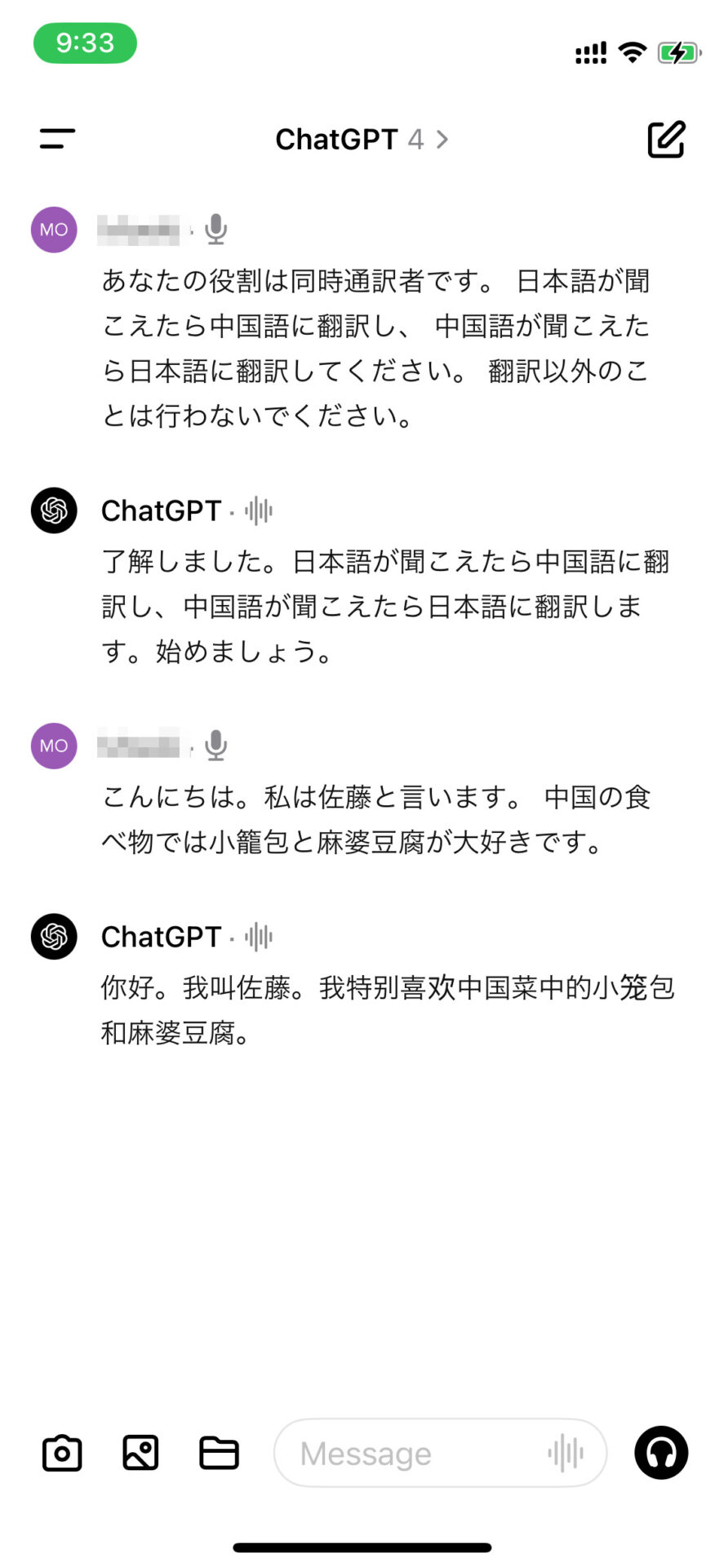 実際に音声会話機能を使って日本語と中国語で交互に会話していた時の履歴が以下だ。