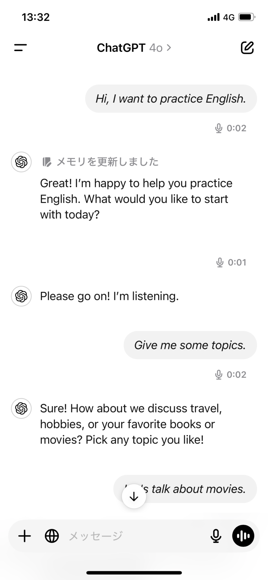 数時間ごとの利用回数に上限があるので、あまり長く会話をしすぎると、この制限に引っかかってしまうかもしれない。