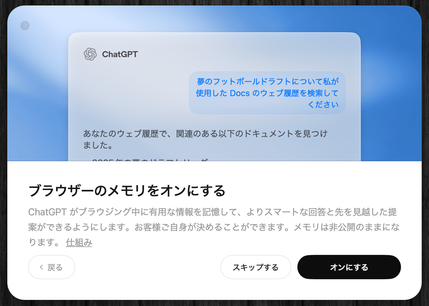 ChatGPT Atlas では、従来からChatGPTが有しているメモリ機能や、ブラウザの閲覧履歴へのアクセスを活用して、よりパーソナライズされたAIとの会話や、次のアクションの提案を受けることが可能だ。