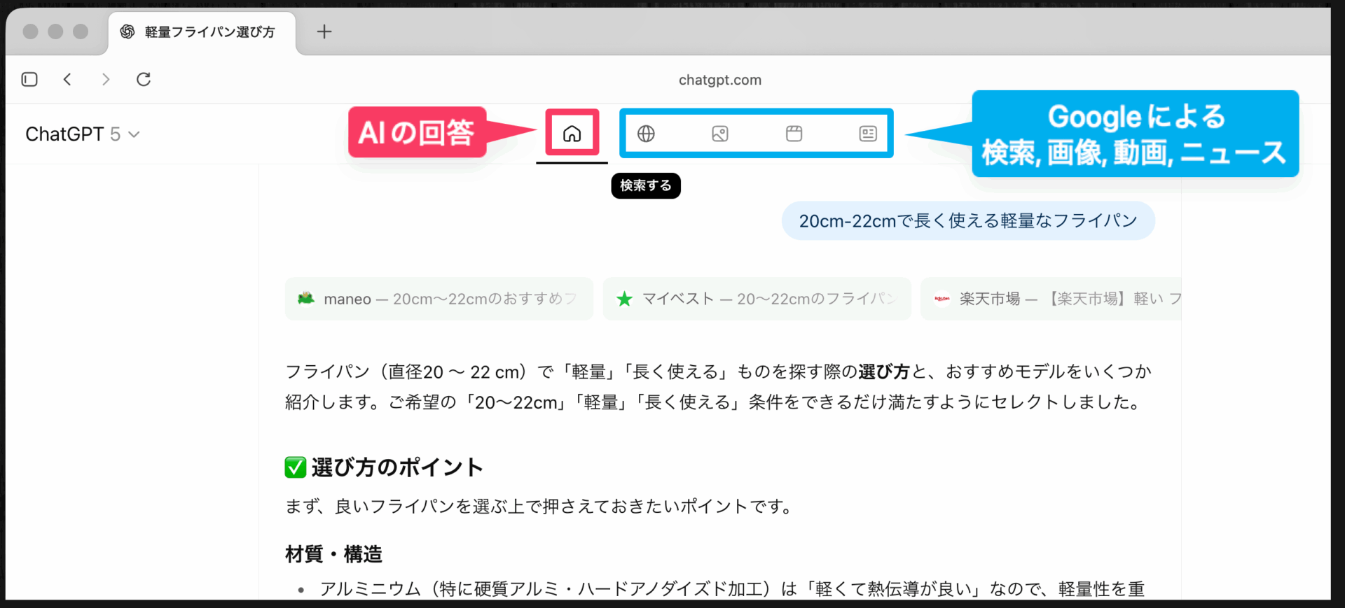 例えば、購入を検討中の商品について主な候補を知りたいとする。「20cm-22cmで長く使える軽量なフライパン」と検索バーに打ち込んでみる。
