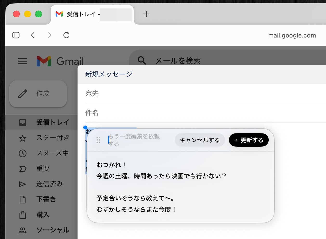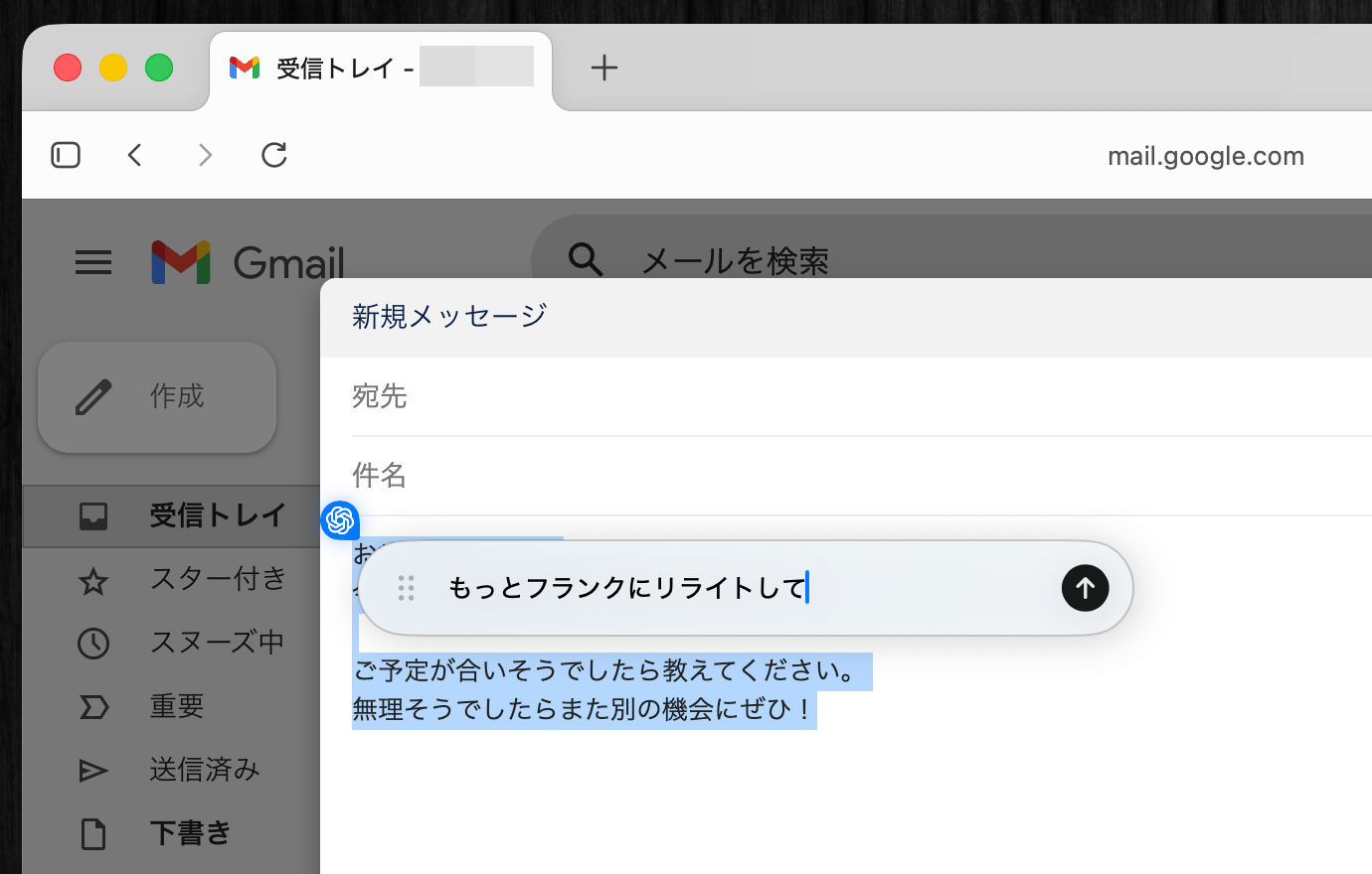 例えば、知人を映画に誘うメールの下書きの途中で、メール本文を全選択し、「もっとフランクにリライトして」とChatGPTに頼んでみる。