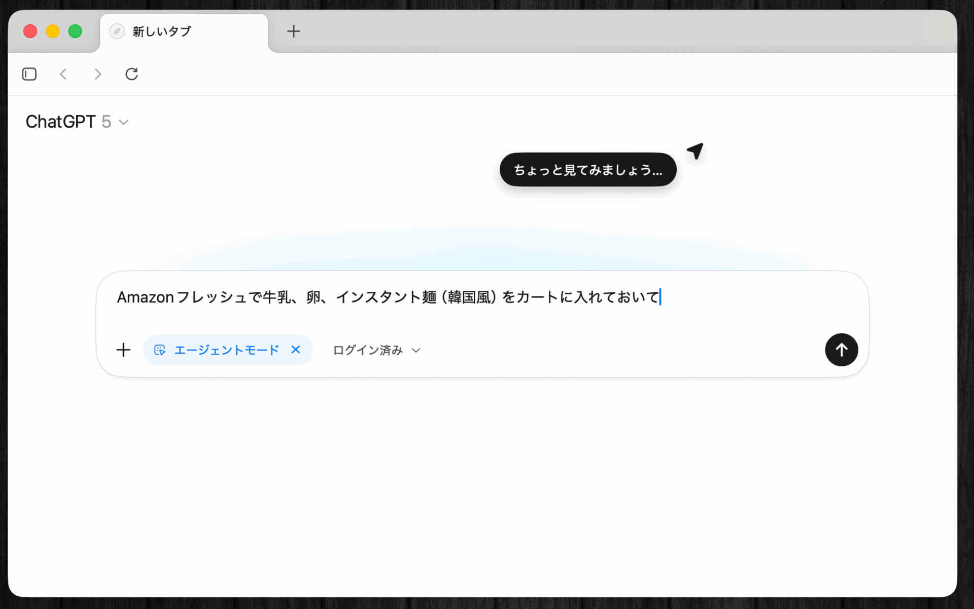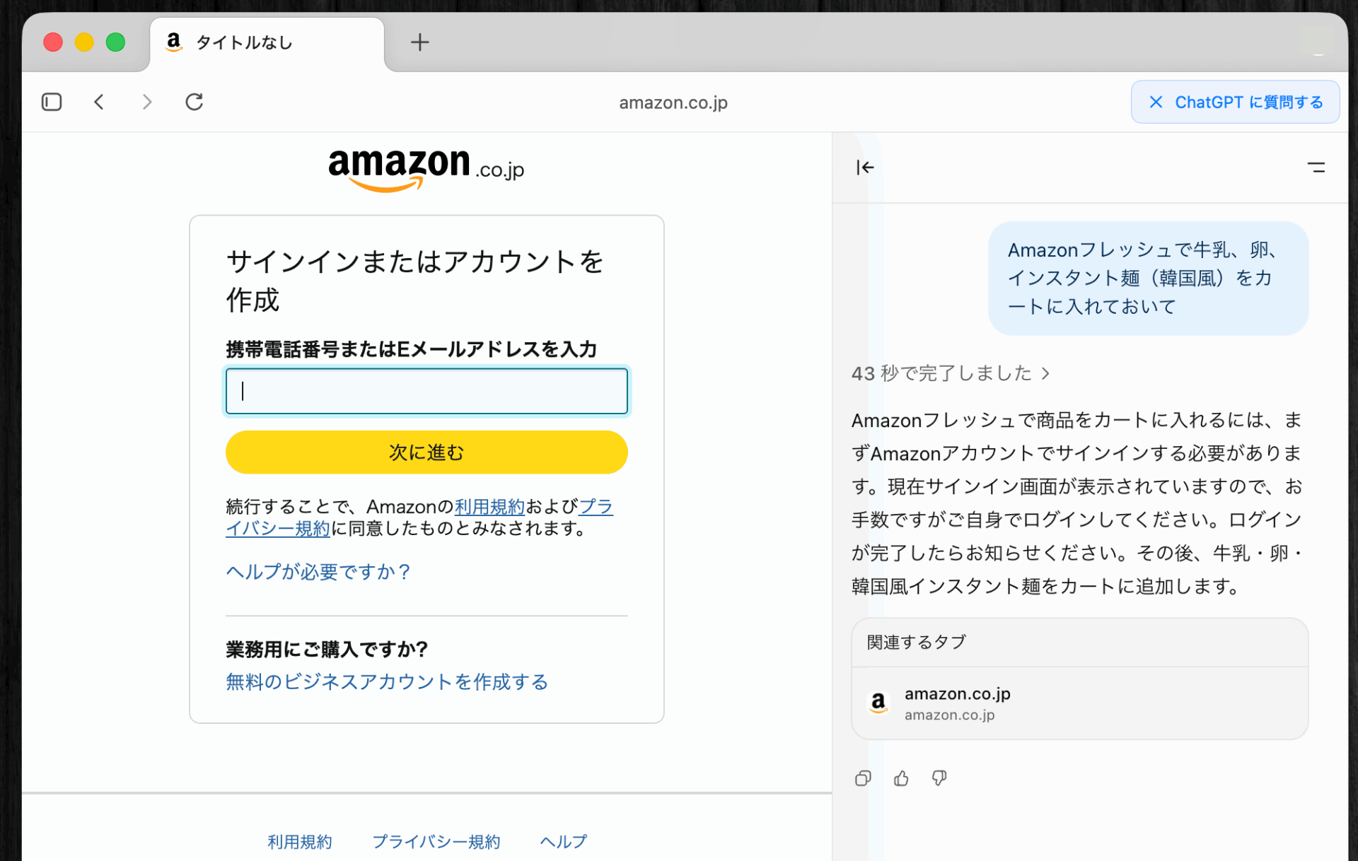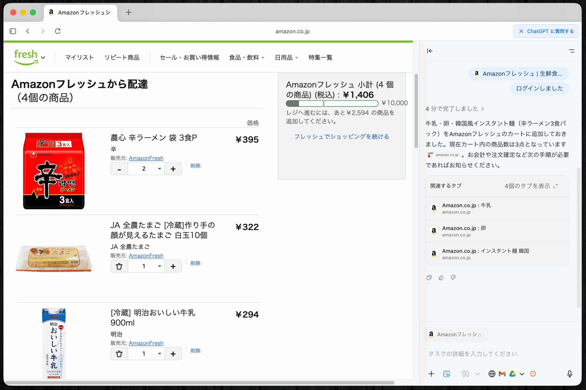 すると、エージェントがAmazonのページを勝手に開き、Amazonフレッシュにアクセスしてくれた。