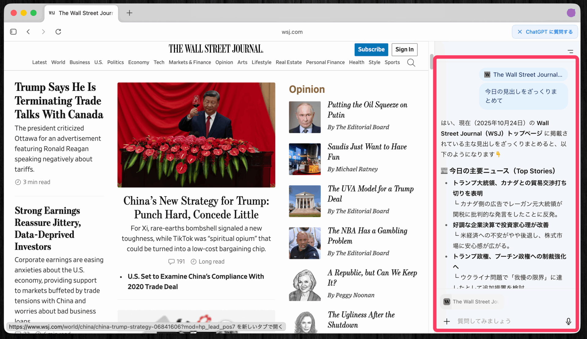 Atlas を利用する一番の利点は、ブラウザ自体にChatGPTが組み込まれているため、表示中のページについてAIと対話が可能である点だろう。