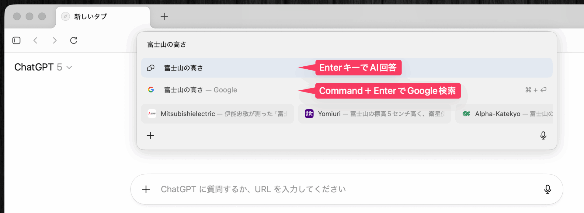 Atlas におけるデフォルトの検索は、全てChatGPTとのチャットが起点になっている。