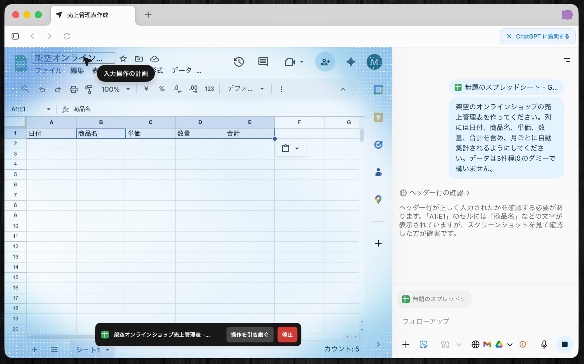 GoogleスプレッドシートをAIに作らせる、なんてことも本当に実行できてしまうのだから感激だ。