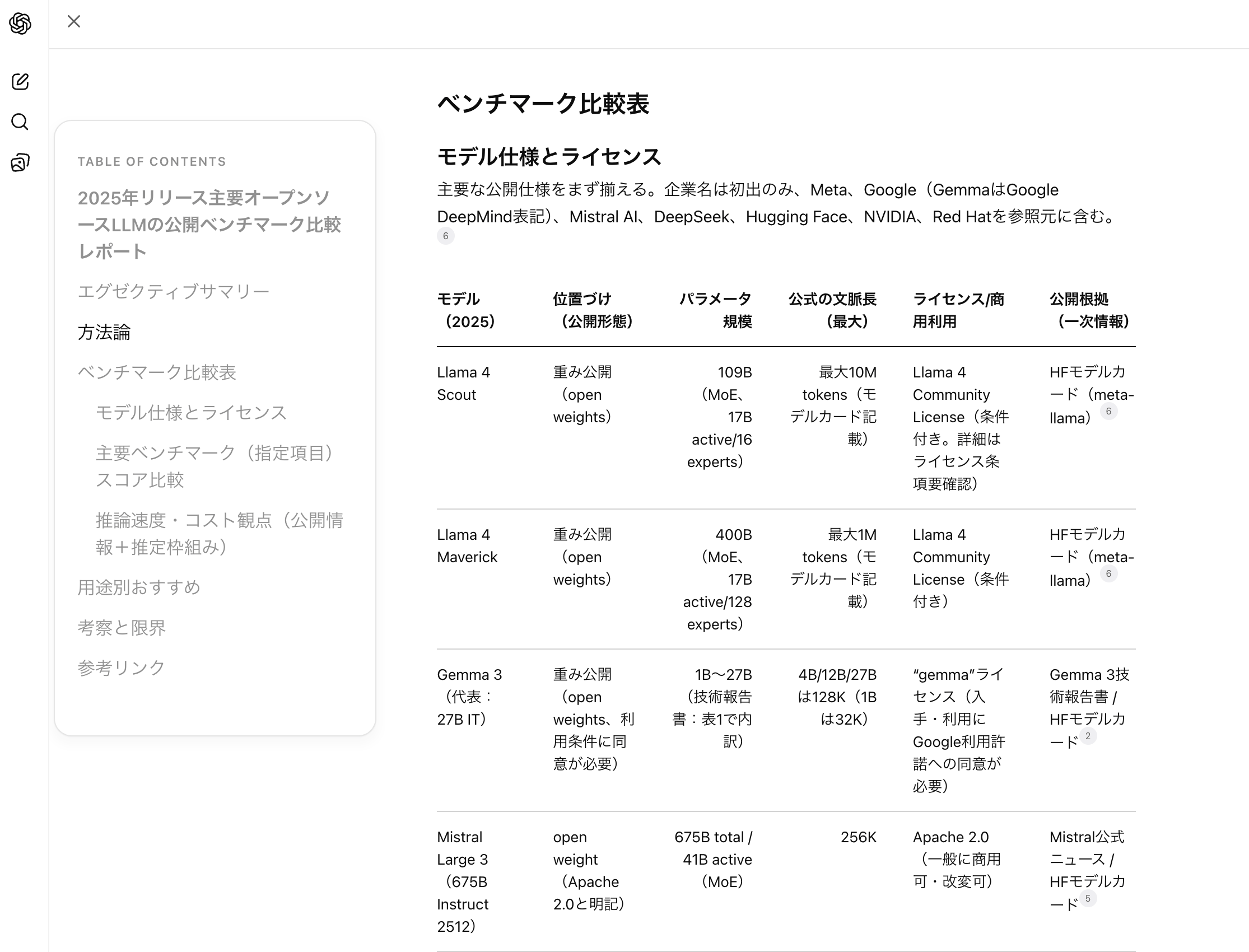 画面の左側には目次が、右側には参照ソースの一覧が配置され、論文やレポートを読むような体験に近づいた。