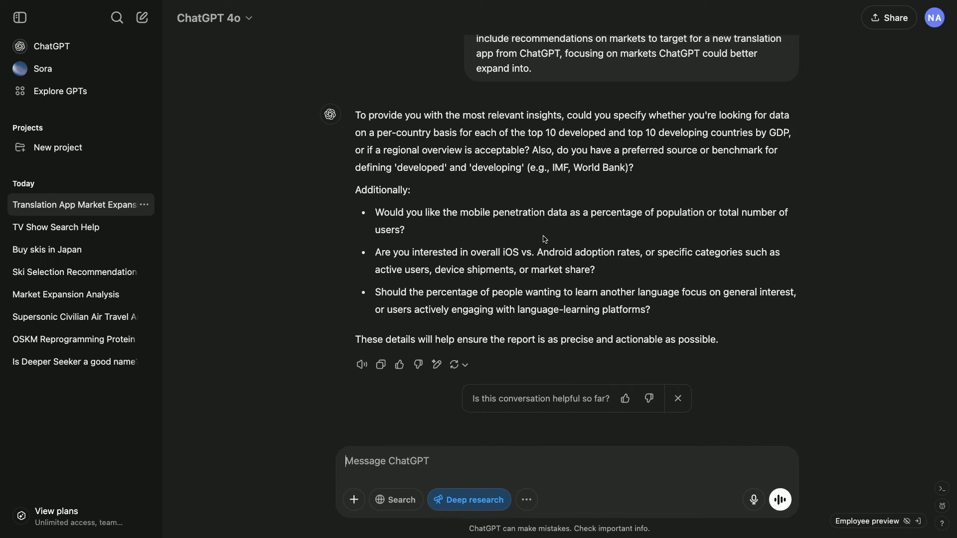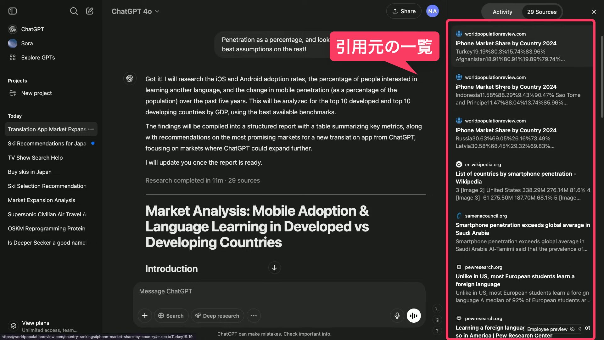 (iOSとandroidの普及率、他の言語を学びたい人の割合、過去5年間のモバイル普及率の変化を、GDPで先進国トップ10と発展途上国トップ10で見つけるのを手伝ってください。また、ChatGPTの新しい翻訳アプリのターゲットとなる市場に関する推奨事項を含めてください。)すると、ChatGPTがリサーチを開始する前に、いくつかの確認質問を返答してくる。
