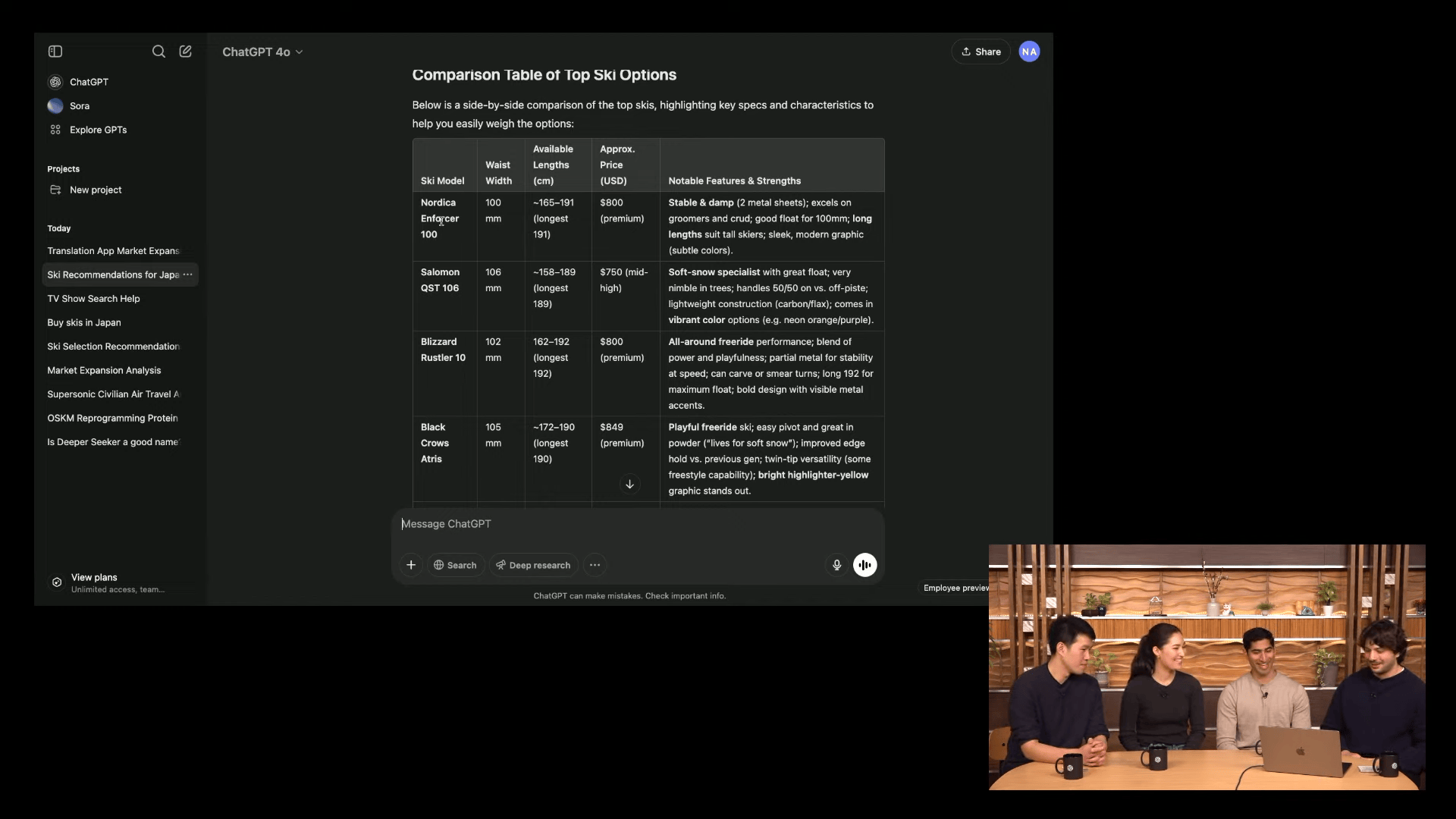 デモでは、スキー用具の購入について、自身のスキーのレベルやスタイルを伝えることで、候補となる商品をChatGPTに挙げてもらっていた。