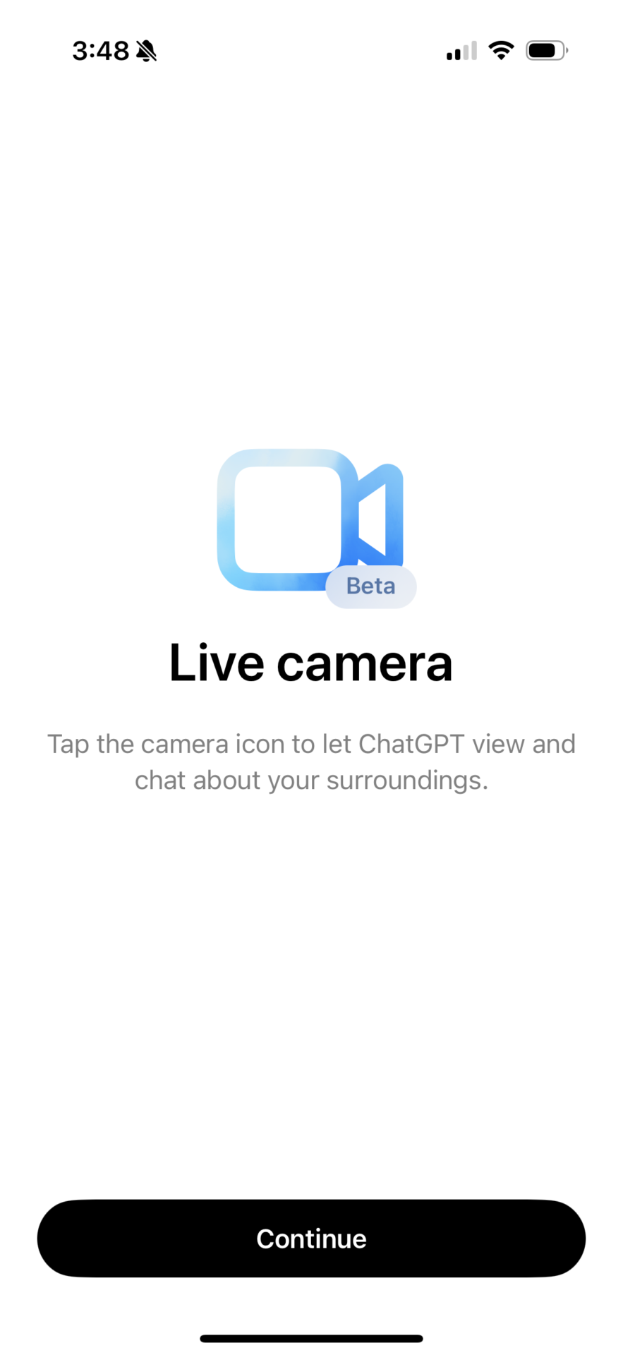 前提として、ChatGPTのアプリを最新版にアップデートする必要がある。アップデート後の初回起動時には、以下のような「Live camera」ベータ版の案内が表示された。