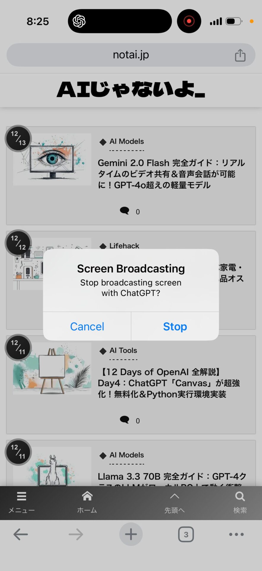 また、iPhoneで「Share Screan」(スクリーンを共有する)を選択してみると、画面の録画が開始され、ChatGPT以外の別のアプリに移動しても、ChatGPTと会話を継続することができる。