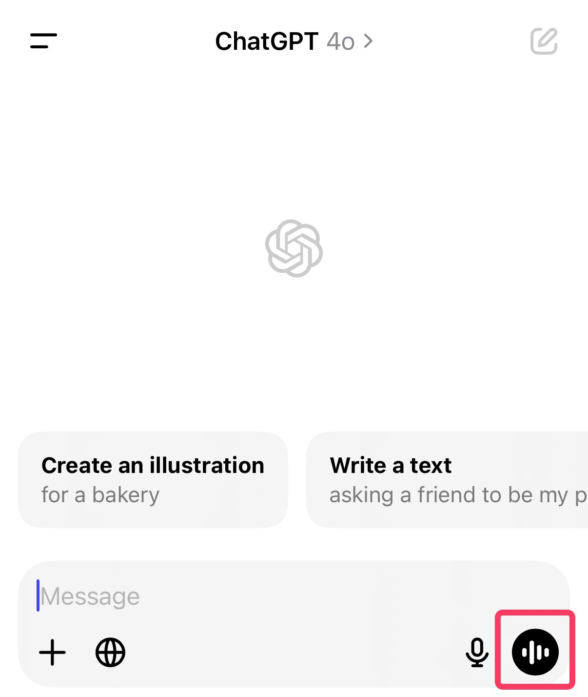 まずは、ChatGPTのアプリの画面右下にある波形のマークをタップして、「音声モード」を起動する。
