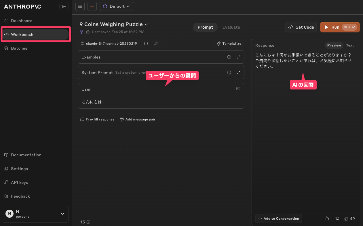 自分でコードを書かなくとも、Anthropicの開発者向けページからAPIアカウントを作成し、「Workbench」というテスト画面を使えば、使いやすいチャット風のインターフェースで、Claudeとのチャットが可能だ。