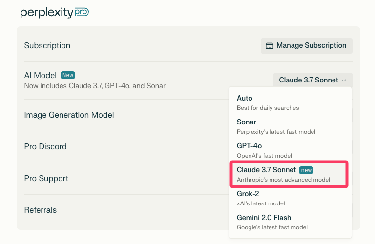 Perplexity Proは月額20ドルだが、GPT-4o、Gemini 2.0 Flash、Claude 3.7 Sonnet、DeepSeek R1などの最先端のモデルを用途に応じて選択して使えるので、各社のサービスに単独で課金するよりお得感がある。