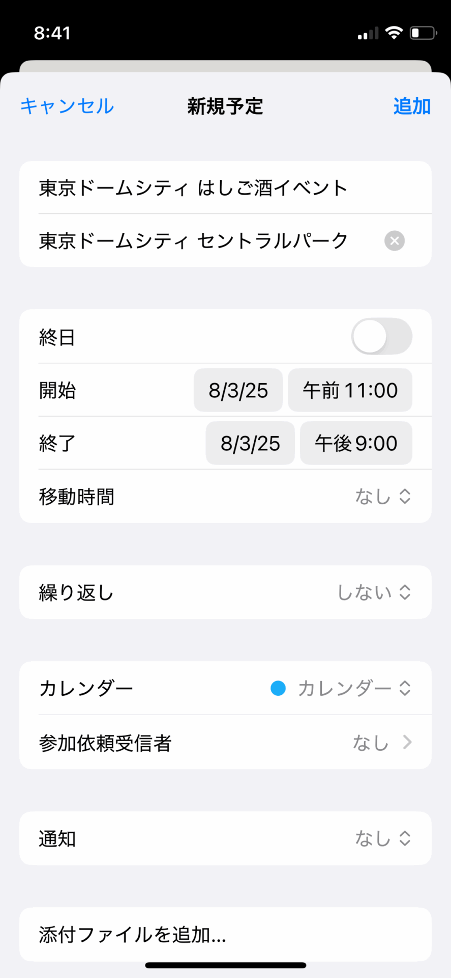 「カレンダーに追加」をタップすると、iPhoneの場合は、カレンダーアプリの新規予定作成画面に遷移する。