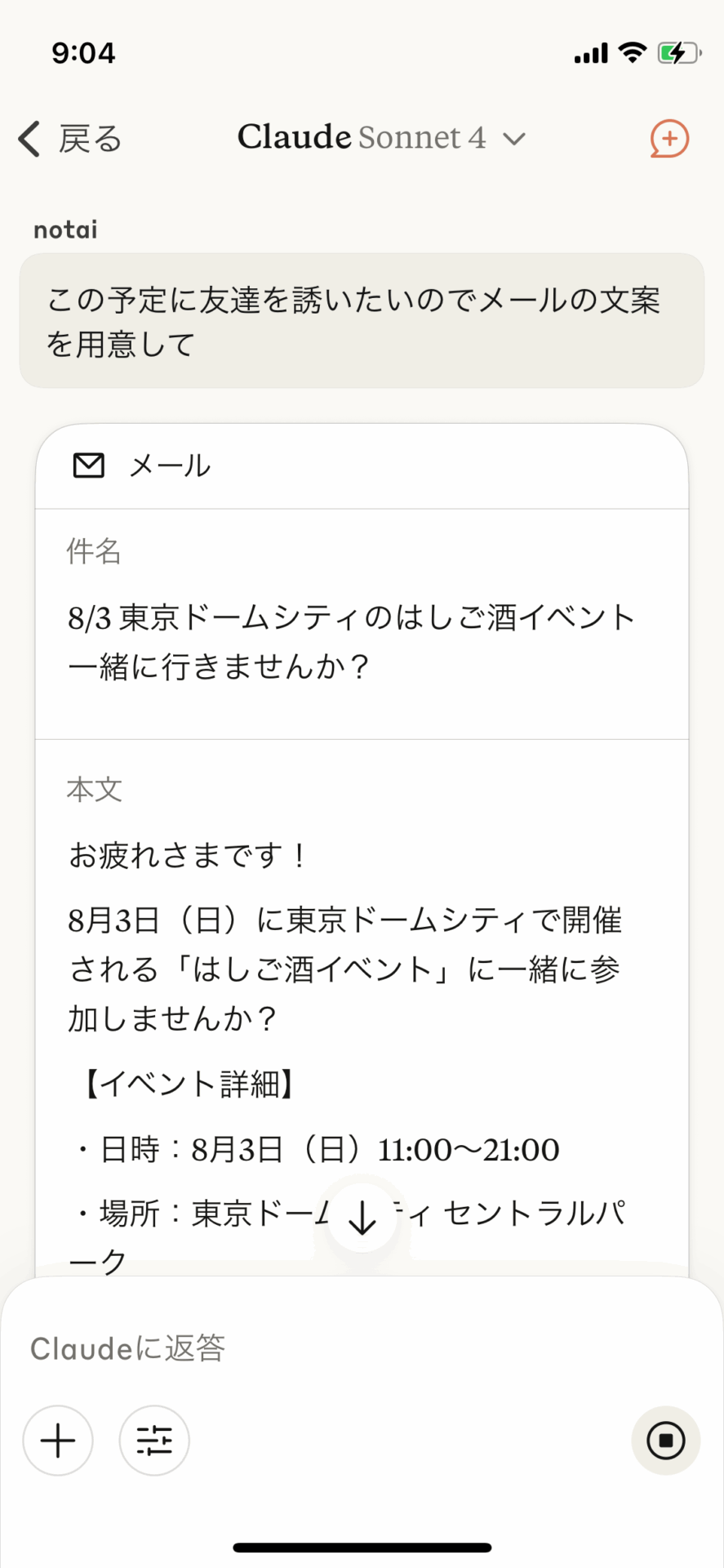この予定に友達を誘いたいのでメールの文案を用意してこのプロンプトだけで、Claude がメールの件名や本文を瞬時に生成してくれる。