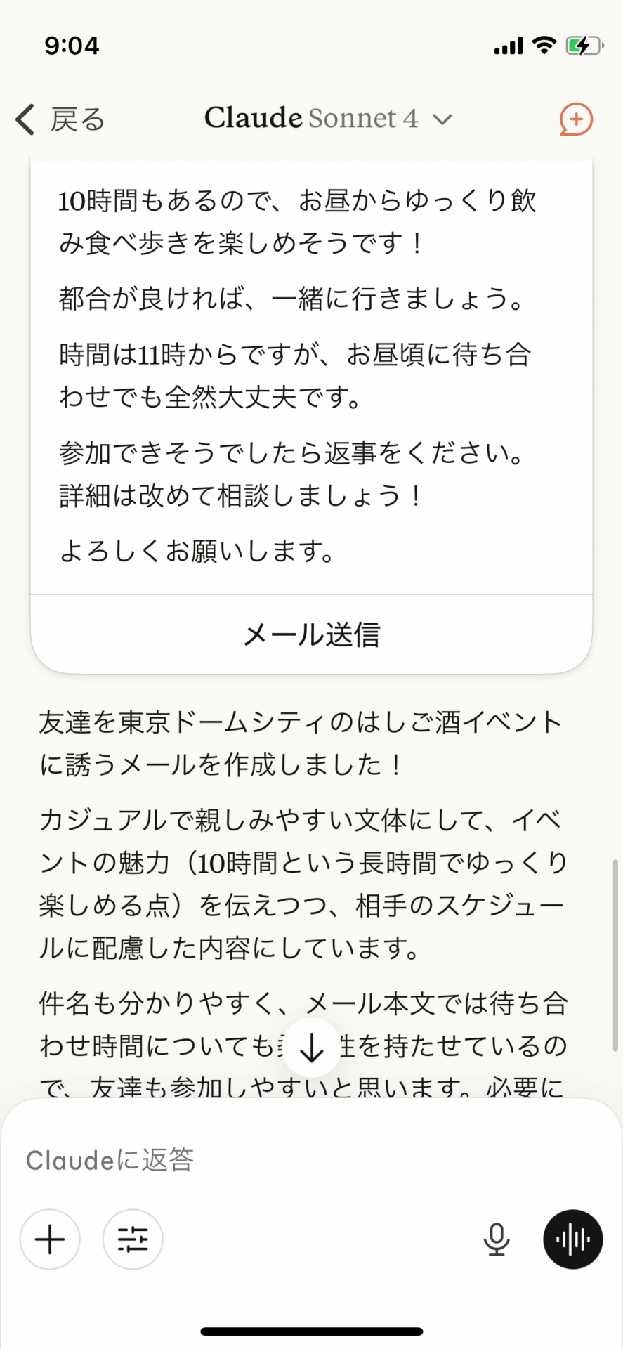 本文は、すべてClaudeが書いてくれたメールを送れば良いだけなので、自分でメールやメッセージを書く手間を省くことができる。