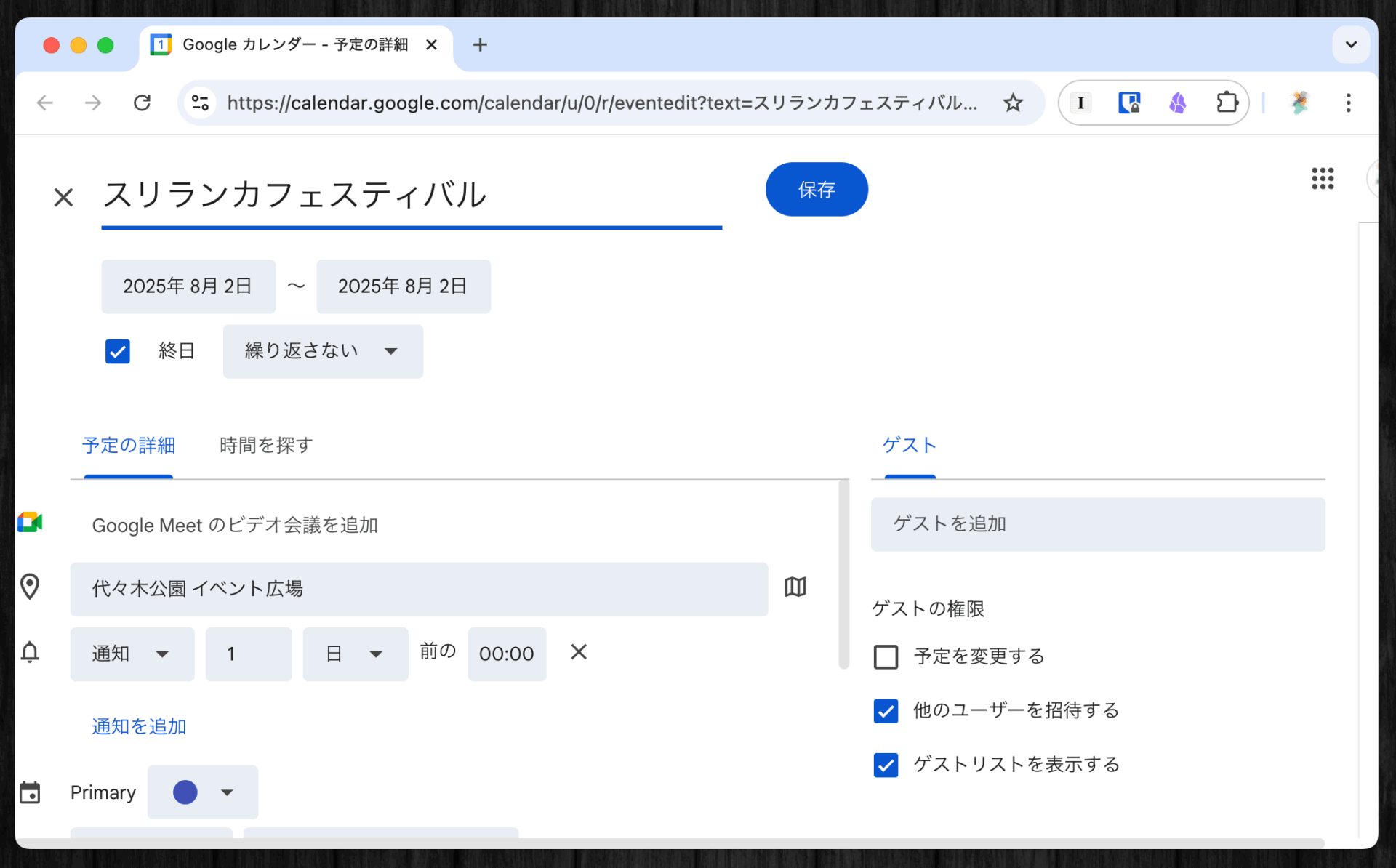 「Googleカレンダーに追加する」をクリックすると、以下のようにカレンダーの予定作成画面に遷移した。
