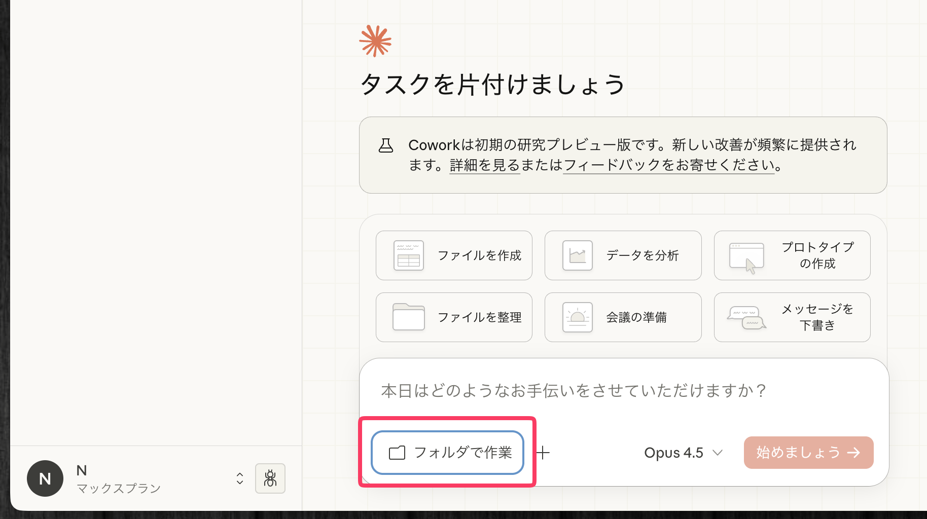 Coworkのウィンドウの下部に、「フォルダで作業」というボタンがあるので、それをクリックして、作業して欲しいフォルダを指定する。
