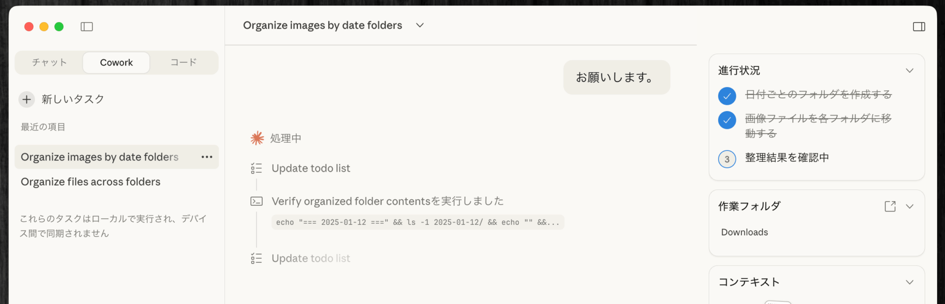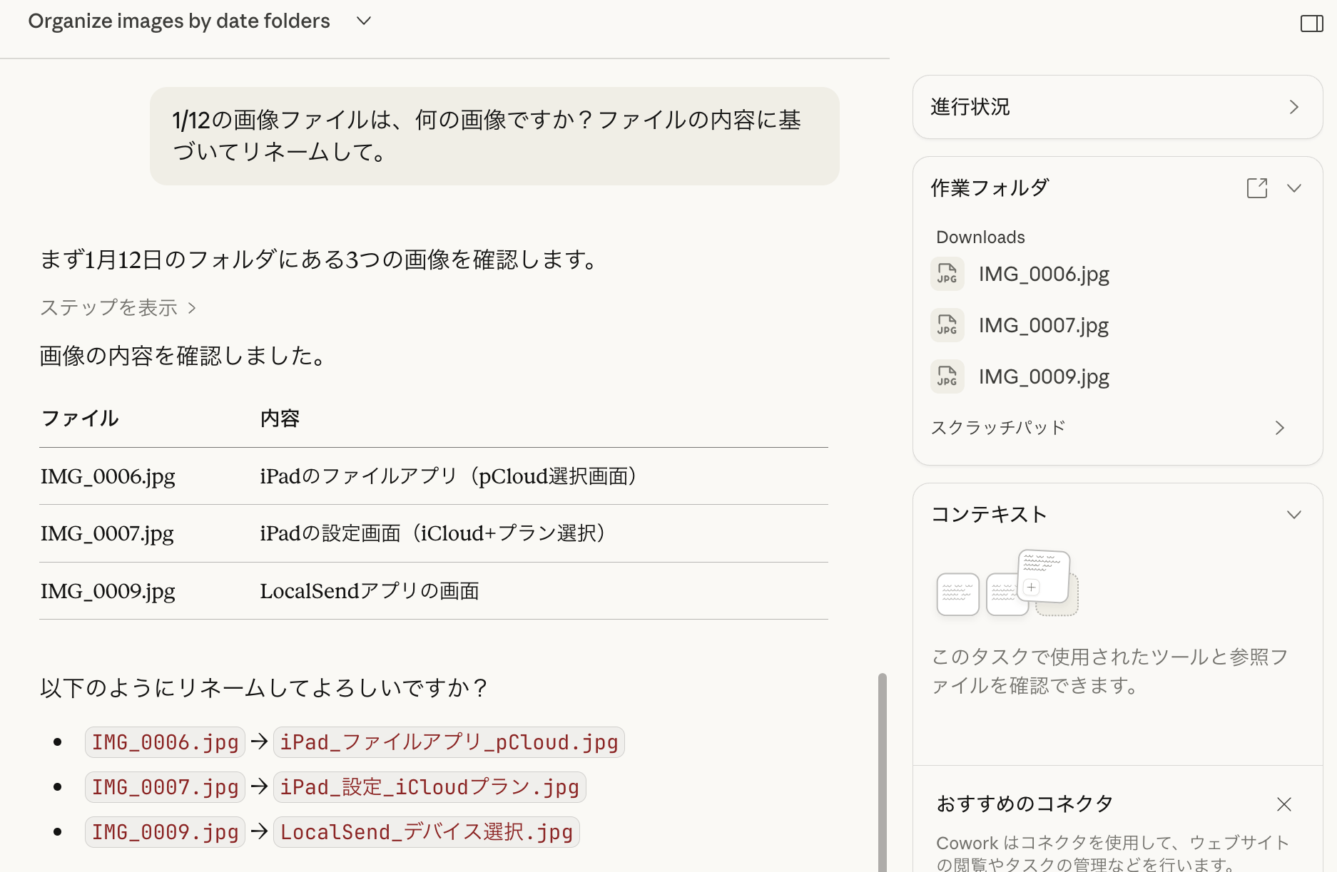 - ファイルの種類ごとにサブフォルダを作成- 「download」や「IMG_」など意味のない名前のファイルは、内容を見て適切な名前に変更Claudeはこのタスクを受け取ると、まず計画を立て、一つずつ実行していく。右側のサイドバーには進捗状況がリアルタイムで表示される。